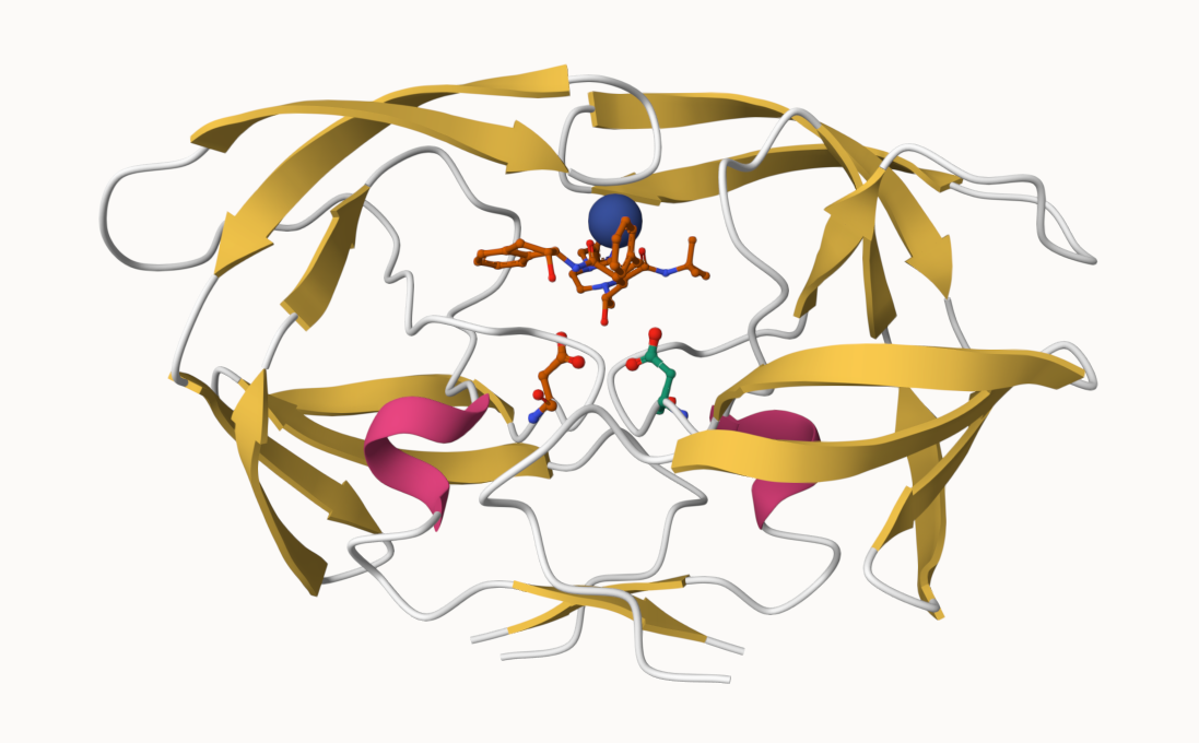 Q. Generate and insert an image of the HIV-Pr cartoon representation colored by secondary strucutre, showing the inhibitor (ligand) in ball and stick.